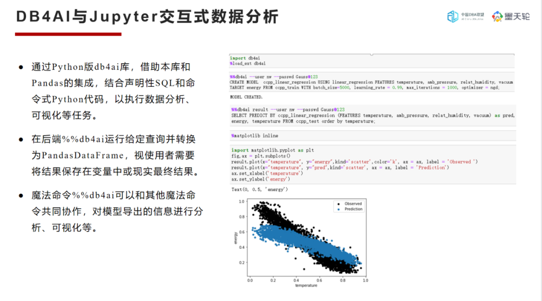 DB4AI与不同的应用相结合,能帮助开发者提升工作效率。“在应用上,DB4AI给用户提供交互式的界面,例如结合Jupyter做交互式的分析。因此,我们提供DB4AI Python库,结合这个命令可以很容易地在交互界面上给用户展示相关信息。这种可以使用Python的方式让用户很容易上手。”李士福说道。