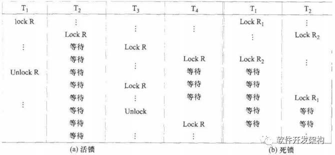如果事务T1封锁了数据R,事务T2又请求封锁R,于是T2等待。T3也请求封锁R,当T1释放了R上的封锁之后系统首先批准了T3的请求,T2仍然等待。然后T4又请求封锁R,当T3释放了R上的封锁之后系统又批准了T4的请求……T2有可能永远等待,这就是活锁的情形,如图11-2所示。