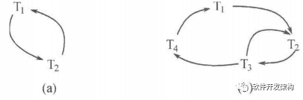 事务等待图是一个有向图G=(T,U)。T为结点的集合,每个结点表示正运行的事务;U为边的集合,每条边表示事务等待的情况。若T1等待T2,则T1,T2之间划一条有向边,从T1指向T2。如图11-3所示。