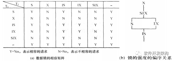 如图11-5所示给出了这些锁的相容矩阵,从中可以发现这5种锁的强度如图11-5所示的偏序关系。锁的强度是指它对其他锁的排斥程度。