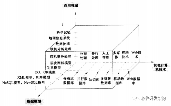 图 13-1 通过一个三维视图从数据模型、相关技术、应用领域三个方面描述了数据库系统的发展历史、特点和相互关系。