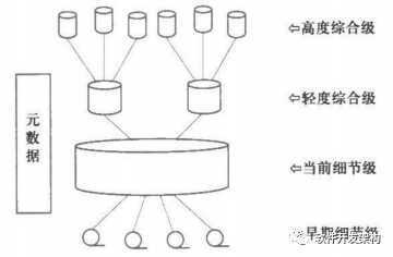 数据仓库中的数据分为多个级别:早期细节级、当前细节级、轻度综合级、高度综合级。数据仓库的数据组织结构如图16-1所示。