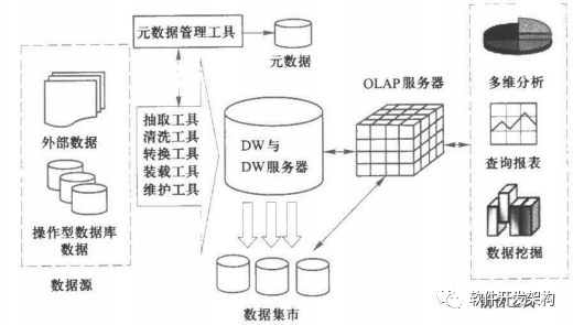 前台工具包括查询报表工具、多维分析工具、数据挖掘工具和分析结果可视化工具等。