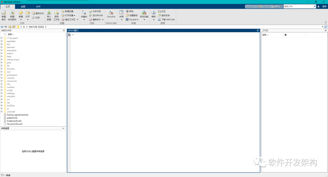 在MATLAB R2020a安装目录下的bin文件夹下,双击MATLAB.exe图标,启动MATLAB R2020a,出现启动界面,如图1-3所示;启动后,弹出MATLAB R2020a的用户界面。