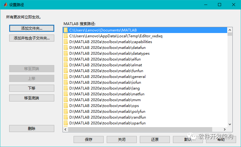 该对话框分为左右两部分,左侧几个按钮用来添加目录到搜索路径,还可从当前的搜索路径中移除选择的目录;右侧列表框列出了已经被MATLAB添加到搜索路径的目录。