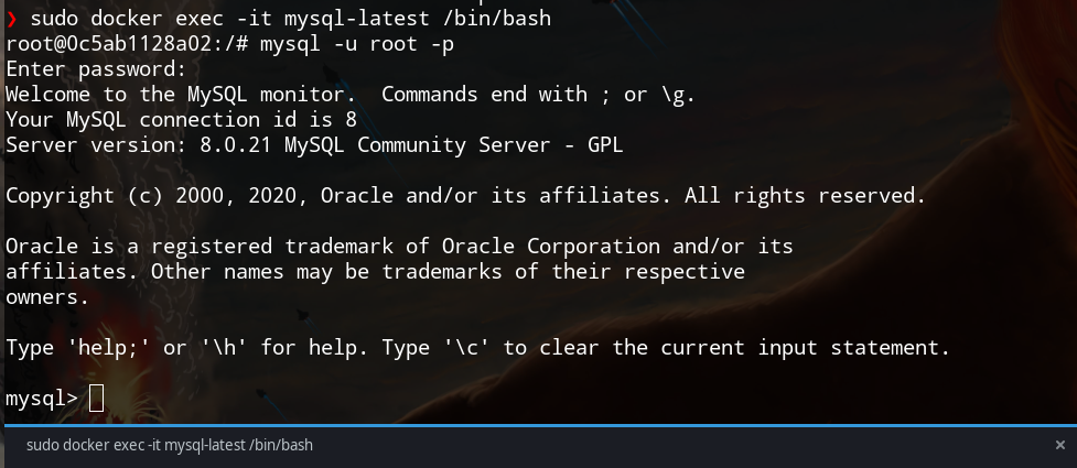 docker run -itd -p 3306:3306 -e MYSQL_ROOT_PASSWORD=123456 --name mysql-latest mysql