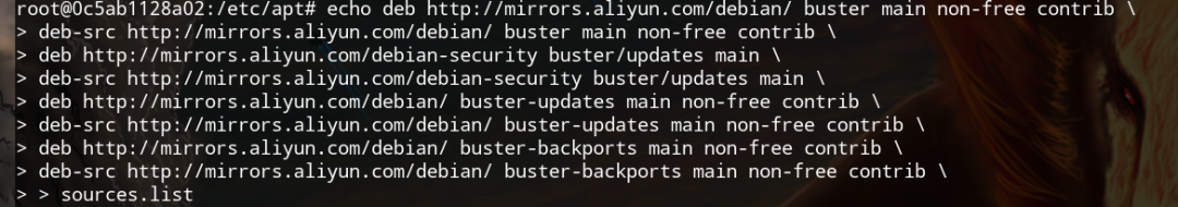 echo deb http://mirrors.aliyun.com/debian/ buster main non-free contrib deb-src http://mirrors.aliyun.com/debian/ buster main non-free contrib deb http://mirrors.aliyun.com/debian-security buster/updates main deb-src http://mirrors.aliyun.com/debian-security buster/updates main deb http://mirrors.aliyun.com/debian/ buster-updates main non-free contrib deb-src http://mirrors.aliyun.com/debian/ buster-updates main non-free contrib deb http://mirrors.aliyun.com/debian/ buster-backports main non-free contrib deb-src http://mirrors.aliyun.com/debian/ buster-backports main non-free contrib > sources.list