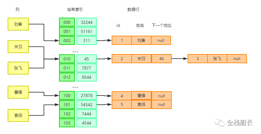如果我们要查询【刘备】,那么先通过计算哈希码hashCode(刘备)=002得到,然后在哈希索引中找到key=002的位置,拿到真正保存数据的磁盘地址311,再去找到数据行。