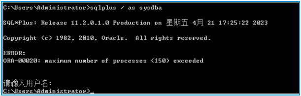 C:\> sqlplus as sysdbaERROR:ORA-00020: maxinum number of proccesses (150) exceeded