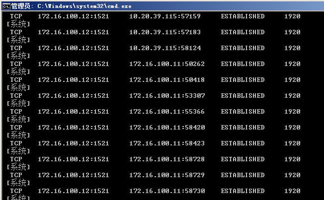 在命令行通过 netstat 查看端口为 1521 的会话数和进程数,最后一列为进程ID: