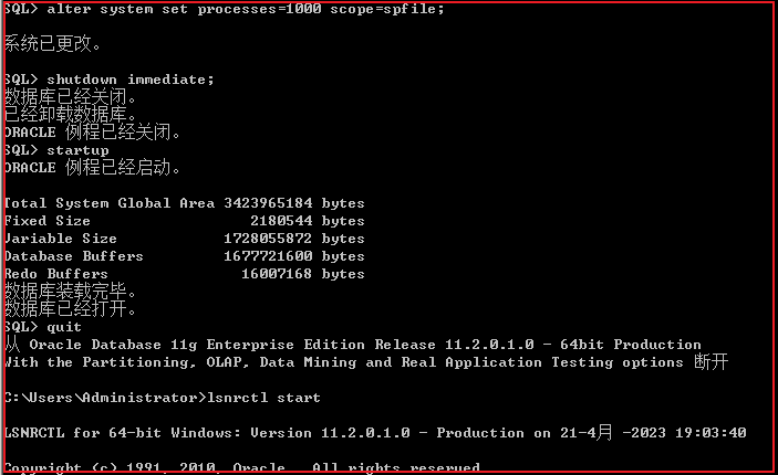当 Oracle 服务通过系统服务正常重启后,此时可以通过 sqlplus 正常连接数据库。下一步就可以修改 Oracle 参数 processes,重启数据库后新的参数即可生效。Oracle processes 默认参数为 150,可以根据系统业务量进行调整,此处设置为 1000。