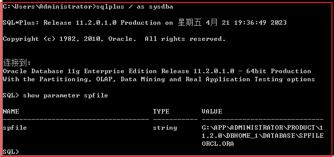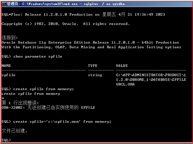当 spfile 存在时,create 语句会失败,也可以用来验证 spfile 文件正被当前实例使用。通过内存参数创建 spfile 是 Oracle 11g 的新特性,在早期版本此命令无法执行。