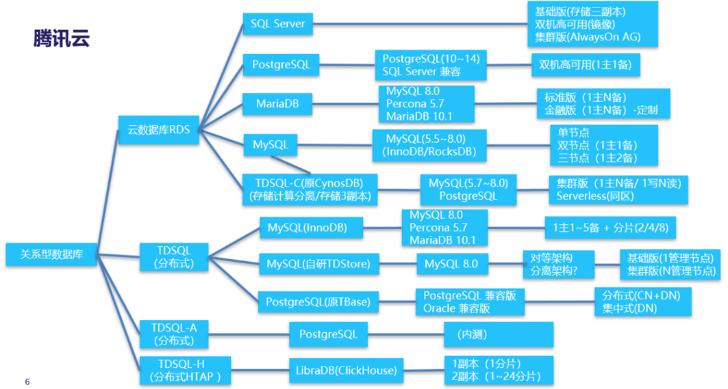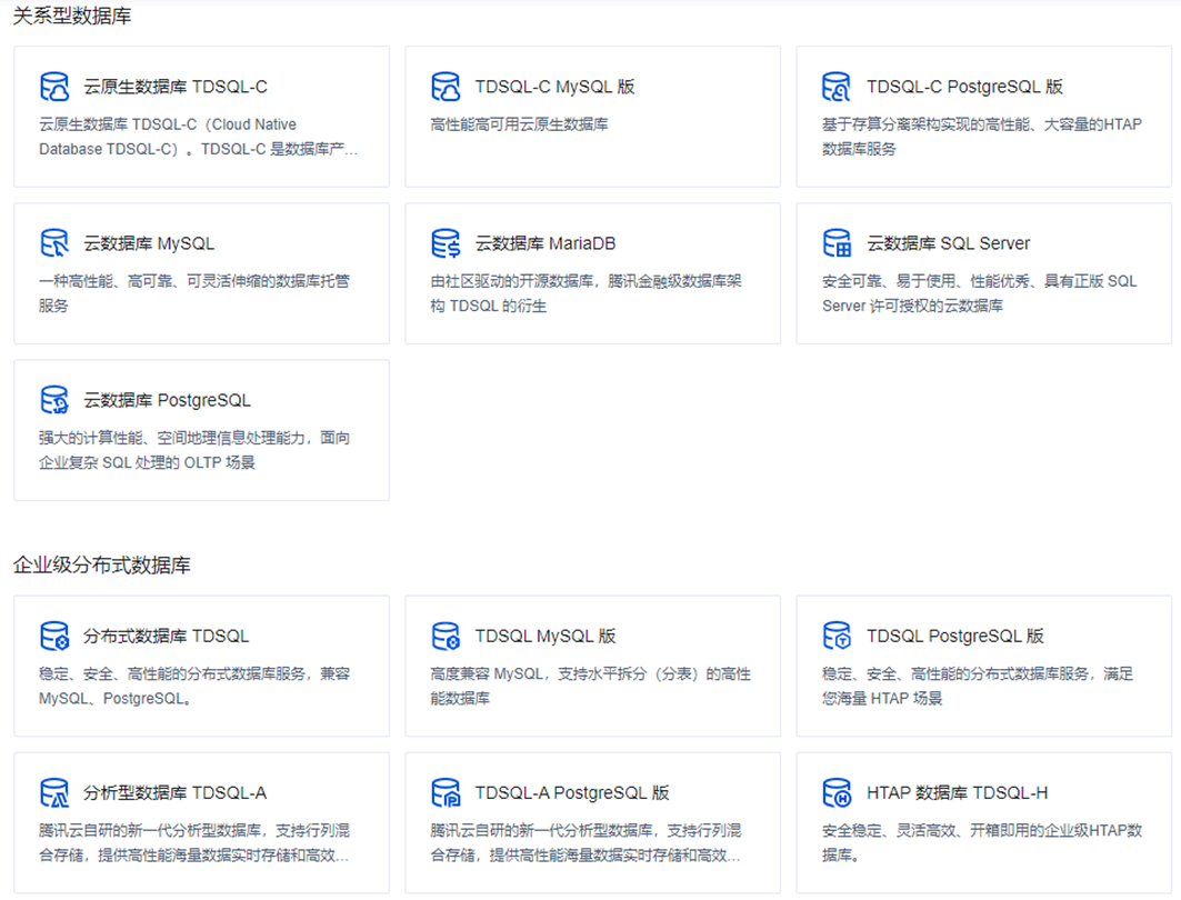 腾讯云分类还是比较乱的,因为它定义了“产品家族”概念,把某数据库产品家族、家族下的数据库都列出在产品页面上。此外,每种数据库还划分不同的引擎、兼容版本、数据库架构,产品购买页也出现不同数据库的交集。似乎是什么都要涉猎,产品管理没有统一。
