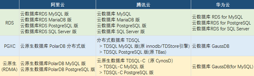为此,我们以阿里云、腾讯云、华为云为例,对这些云数据库产品进行分类,分别介绍其功能特点。