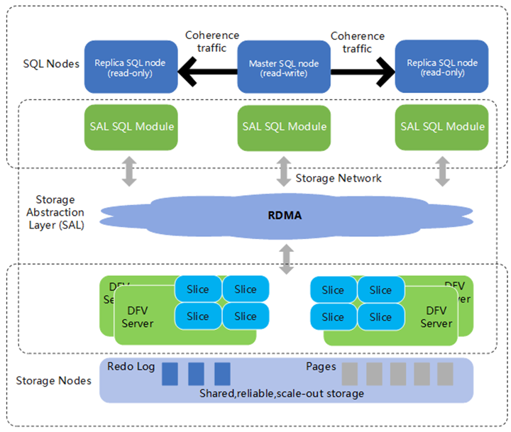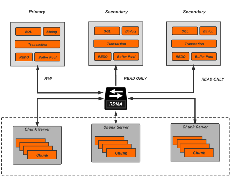 云原生采用计算与存储分离、共享存储(Share Storage)的整体架构,通过RDMA高速网络互连向上层计算节点提供块设备服务。集群提供一个主节点与多个只读节点,存储节点组成分布式存储,通过分布式一致性算法维护多个副本,不再需要我们分库分表了。