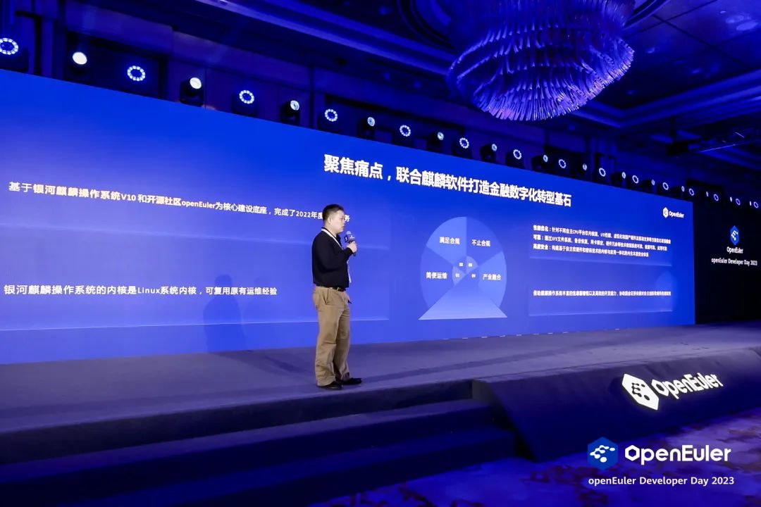 作为“openEuler最佳实践伙伴”和社区第二大贡献者,麒麟软件积极针对行业实际场景进行联合创新。在21日大会主论坛用户分享环节,国金证券信息技术部基础架构经理李卓以《国金证券携手麒麟软件打造金融数字化转型应用实践》为主题,介绍了国金证券以银河麒麟高级服务器操作系统V10为核心底座,建设全栈自主创新极速交易系统的情况。