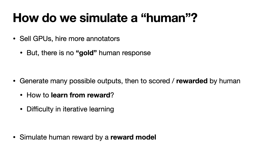 具体而言,这些工作通过一个反馈模型(RM)模拟一个人对LLM输出的偏好程度打分,并让LLM利用这一反馈优化其输出策略,进而得到一个能输出“令人满意”的内容的LLM。那么如何让LLM根据RM的反馈优化策略?这便是强化学习所擅长解决的问题,下文将介绍其使用的主要方法;而这一利用“人”的反馈进行强化学习的思路也被称为RLHF。