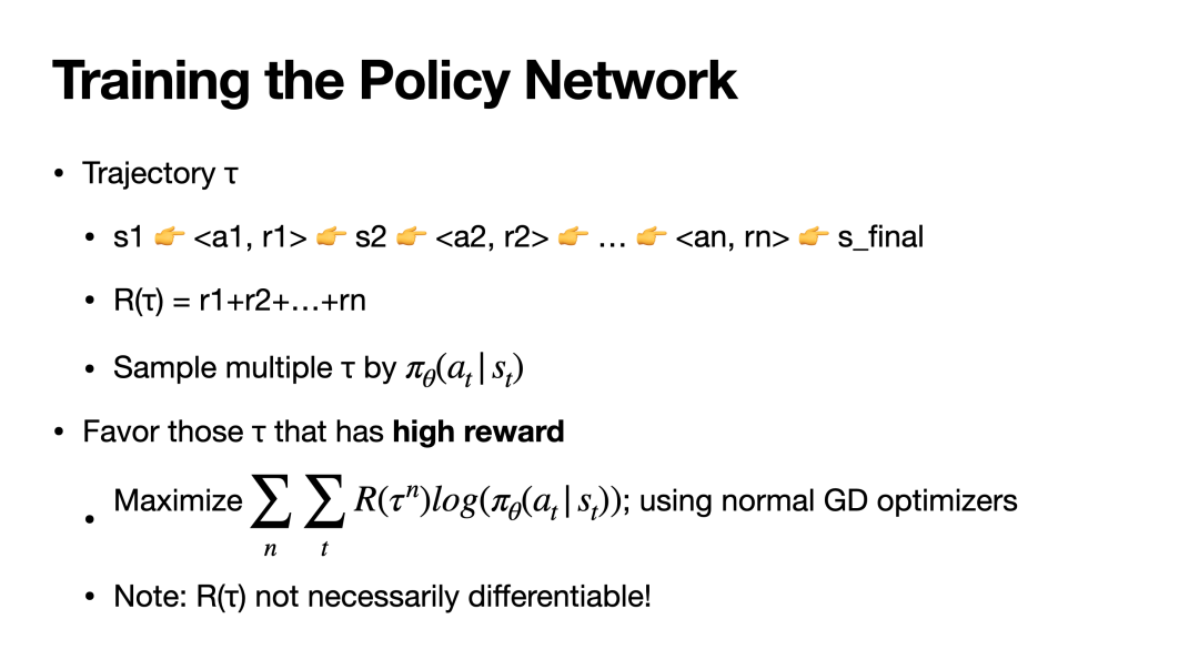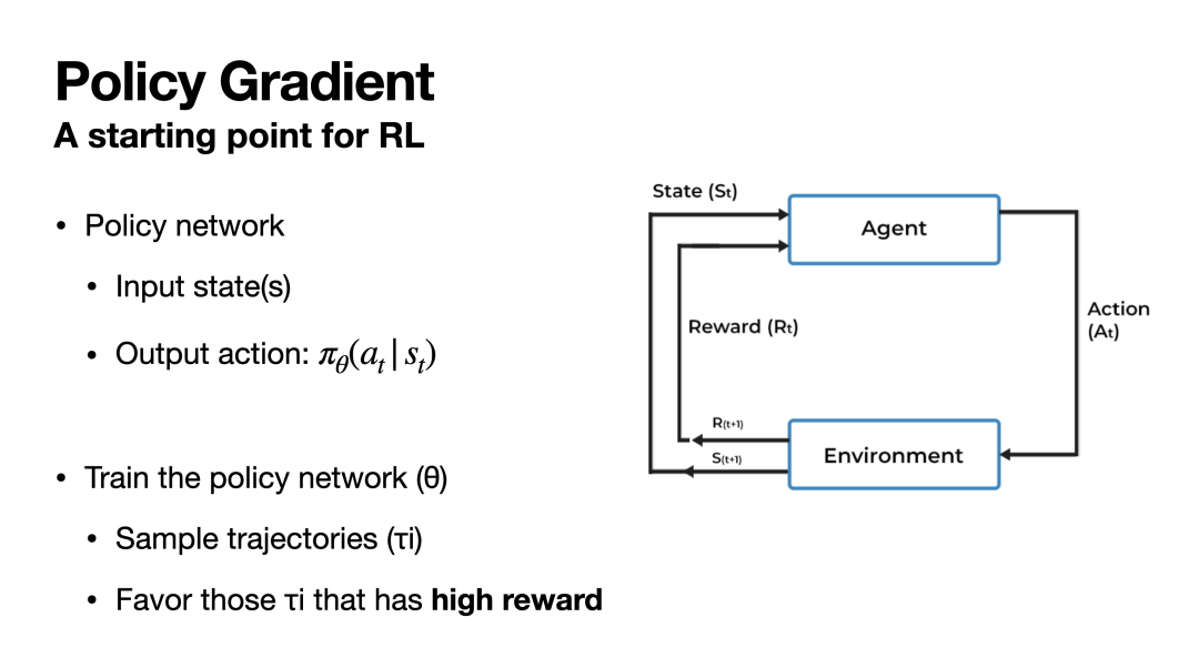 不难发现,上图中的公式就衡量了给定策略下采样若干轨迹所能得到的期望奖励,利用梯度上升优化这一目标即可使得策略往“奖励更大”的方向优化,即得到更优的策略。这一直接的思路被称为策略梯度,是RL的基础方法之一。