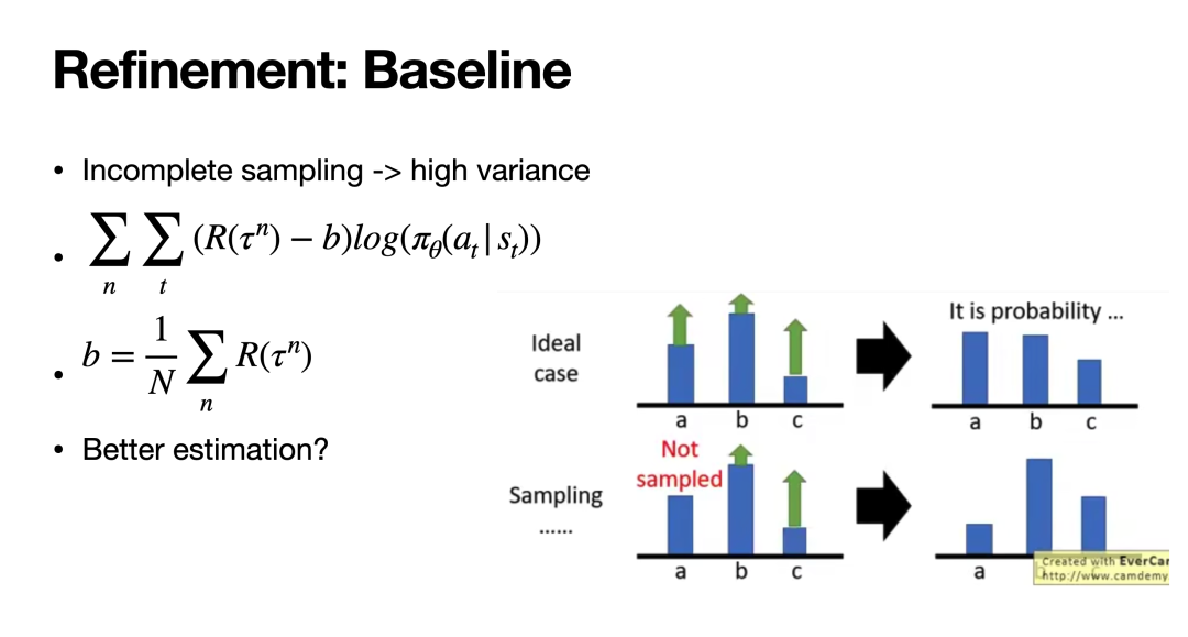 这便是Baseline的思想:通过一个变量b估计所有轨迹奖励的平均水平,并在最终的优化目标中将轨迹的奖励减去b,即可实现奖励的有正有负。这样一来策略梯度训练就可以变得稳定一些。
