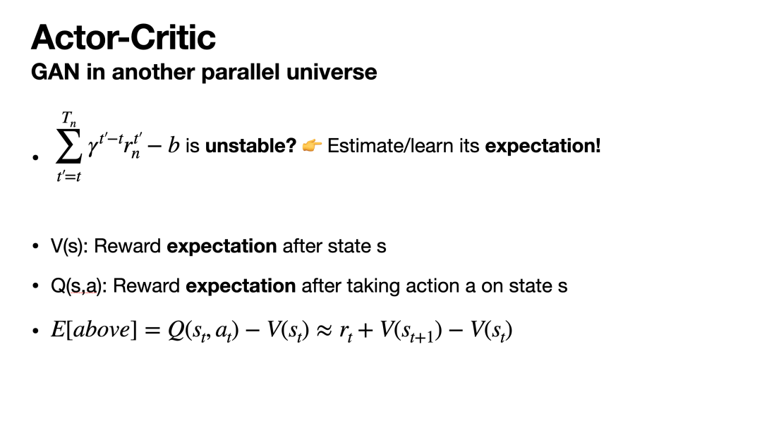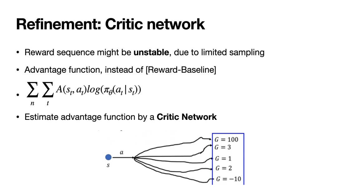 然而,引入baseline并没有彻底解决方差的问题。一方面,b本身也需要通过采样-平均来估计,这本身无法保证b的准确性;另一方面,上述所有计算都是针对一些采样到的轨迹计算得到的奖励,这可能与轨迹真正的价值存在偏差。因此,我们希望直接估计某条轨迹的“价值”,亦即它的总奖励的期望,这便是接下来即将介绍的Actor-Critic的思想。