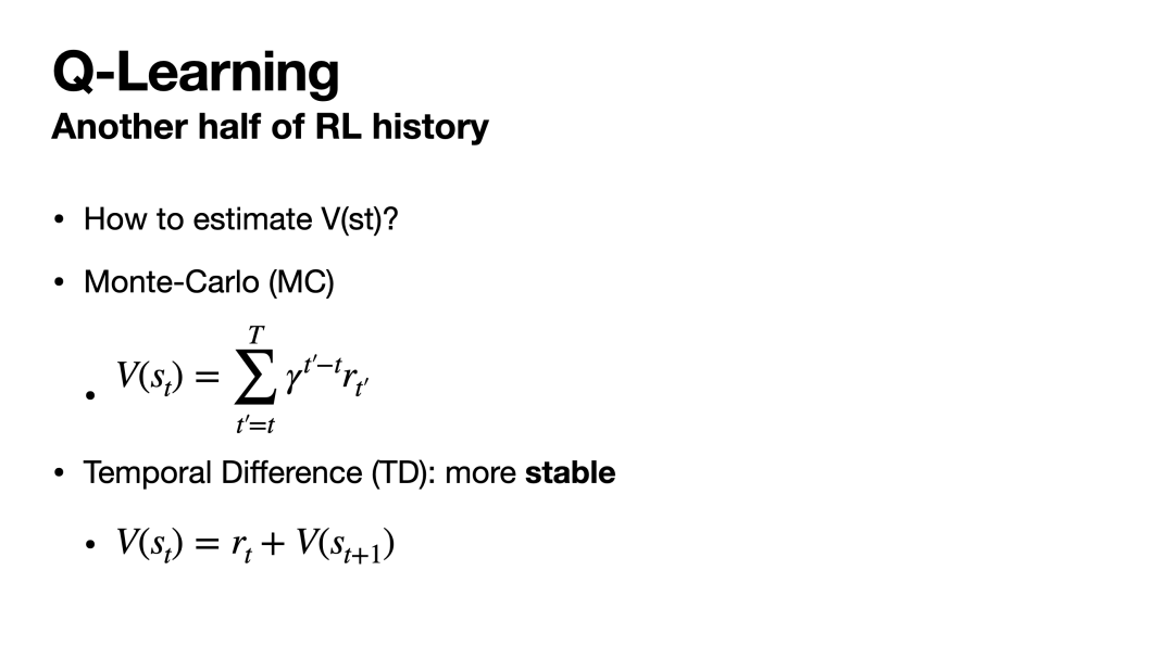 为此,我们需要先简单介绍一下Q-learning相关的概念。现在我们用V(s)代表采取某种策略下,状态s后所能获得的期望收益。如果我们能准确估计V(s),那优势函数即可被表示为 A(st,at) = rt+V(s[t+1])-V(st)。这是因为优势函数衡量的就是在st下采取at后,相比起采取其他动作能带来多少额外收益;在st下采取at本身获得了奖励rt,在之后有期望收益V(s[t+1]),而本来采取所有其他动作所对应的期望收益就是V(st)。显然,上式是优势函数的一个正确表示。
