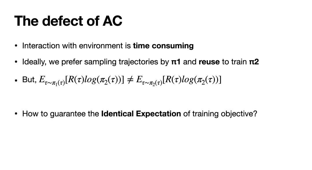 Actor-Critic虽然解决了方差高的问题,但在实践中仍可能遇到困难。具体而言,训练AC时需要与环境交互来采样很多轨迹,然后利用这些轨迹训练Actor和Critic;然而,这一过程是十分费时的,这可能导致我们无法高效的采集大量数据,进而充分的训练模型。因此,我们考虑是否能将已有的轨迹数据复用以提高训练效率。