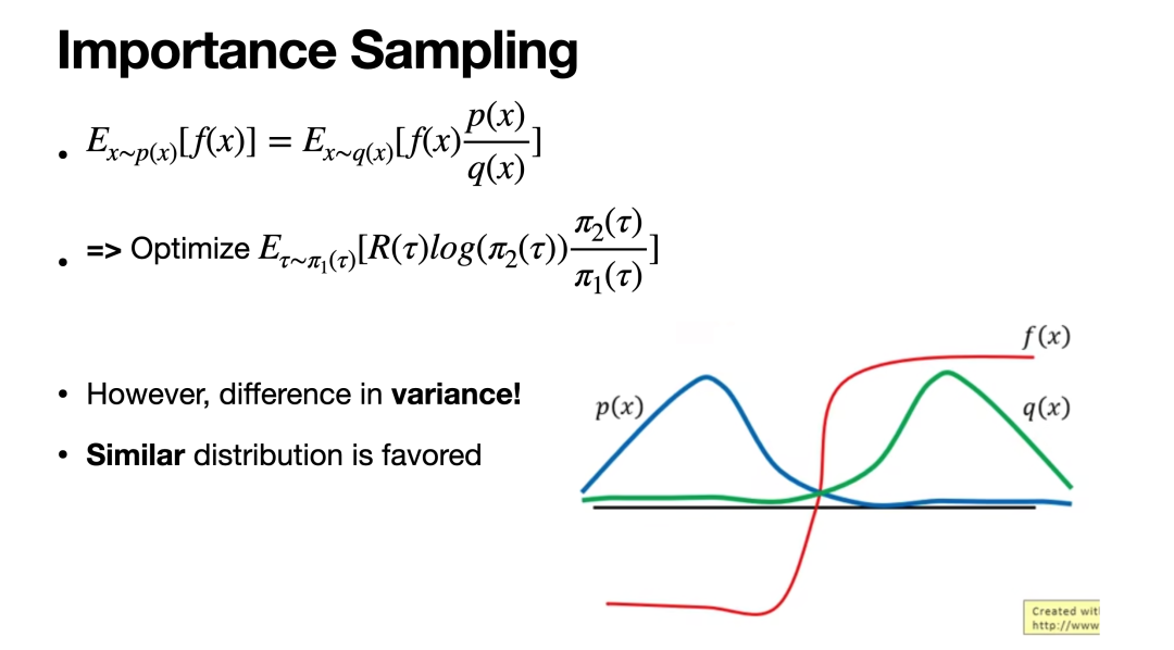 但这又引入了一个问题,虽然此时二者期望相等,后者的方差可能显著大于前者,进而再次导致训练不稳定。可以证明,如果我们保证π1与π2的分布不相差太远,后者的方差便不会显著增大。因此,在进行off-policy RL时我们还需要尽量控制π1与π2间的差距。