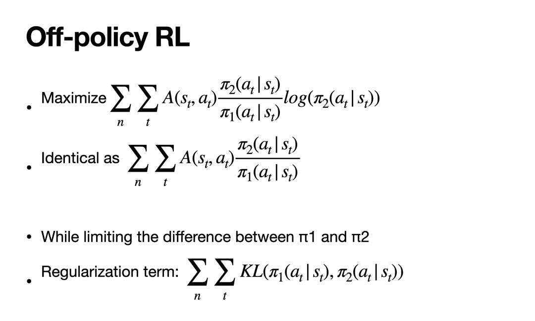 将上述内容总结,即可得到Off-policy RL的总体思路:优化调整后的训练目标,同时保证π1与π2分布的KL散度尽量小,如下图所示。值得注意的是,优化目标中的π2/π1项是一个标量而非概率分布向量,在求梯度时它是不可导的(不像后面的log(π2)可导),因此,在求梯度后,下图中第一行的优化目标实际上与第二行等价,因此我们实际上可以用更简洁的第二行作为训练中的实际优化目标。
