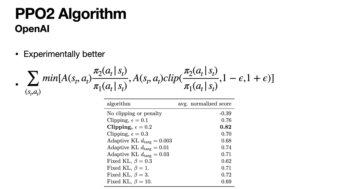 有了这些铺垫,我们终于得到了一个可以高效训练的RL算法:Proximal Policy Optimization(PPO),近期获得很大关注的InstructGPT、ChatGPT便在底层使用了PPO进行强化学习。PPO是一种对上述Off-policy RL目标的实现,分析其优化目标不难发现,它首先最大化原始优化目标A*π2/π1,其次又防止π2/π1偏离1太多,即控制了两个分布的差距。实验证明,这一实现相比简单通过KL惩罚项实现的Off-policy RL效果更好。