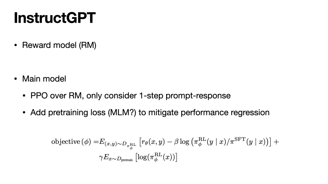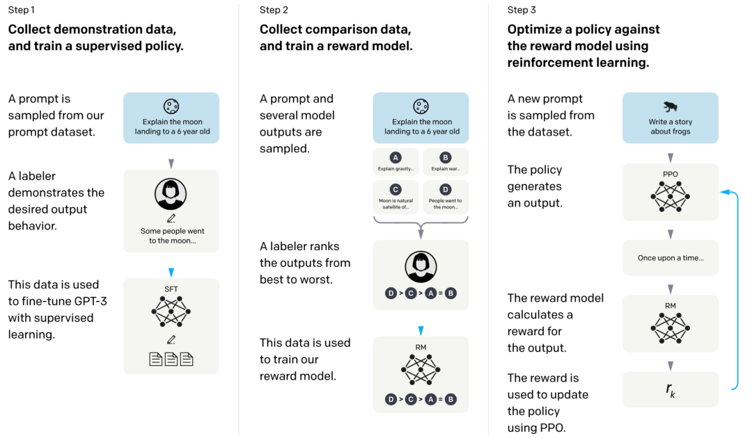 最后我们简单介绍一下ChatGPT的核心方法——InstructGPT是如何利用上述方法进行RLHF的。如下图所示,InstructGPT的核心由两个模型构成:1)一个反馈模型(RM),它给定一对模型输入和输出,反馈该输出的合理程度(有多好)打分;2)一个生成式语言模型,给定输出生成一段输出,并利用RM给出的打分作为奖励进行强化学习。只要让RM能很好的反应人类的偏好,我们就可以让生成模型与人类行为进行对齐。