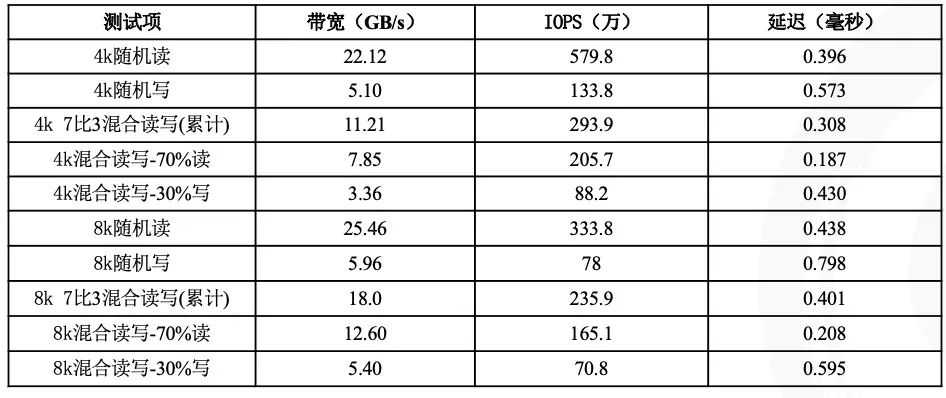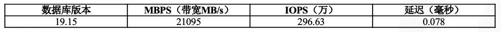 (说明:本次测试使用6个1000GB的卷创建DG_DATA01,使用Calibrate_IO工具以数据库IO逻辑进行测试,1M块大小顺序读带宽为21095MB/s;8k块大小随机读IOPS为296.63万,平均延迟0.078毫秒。)