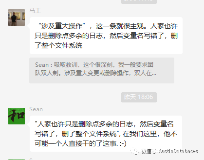 3 那么产生问题后的第一个工作是什么,如你经常误删除数据,那么第一个想法是我要产生一个工具来禁止我误删除数据,还是我们总结你怎么就误删除数据,通过你的操作我得出一个工作方法来帮助你尽量不误删除工作。按照正常人的思维逻辑都是,先建立一个规范,进行限制,如你操作删除的操作时,必须两个人进行处理,不能一个人进行删除数据库的操作。