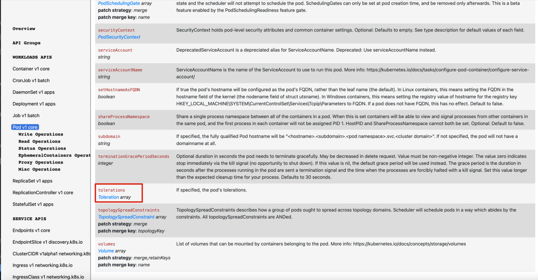 从 Kubernetes API 文档中可以看到 PodSpec 的 Tolerations 字段在其字段标签中没有键 patchStrategy