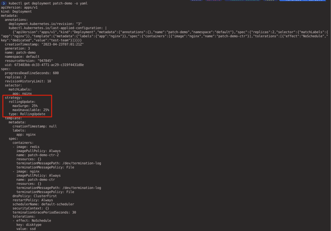 我们之前创建的 patch-demo Deployment 使用的是默认的 RollingUpdate 策略。