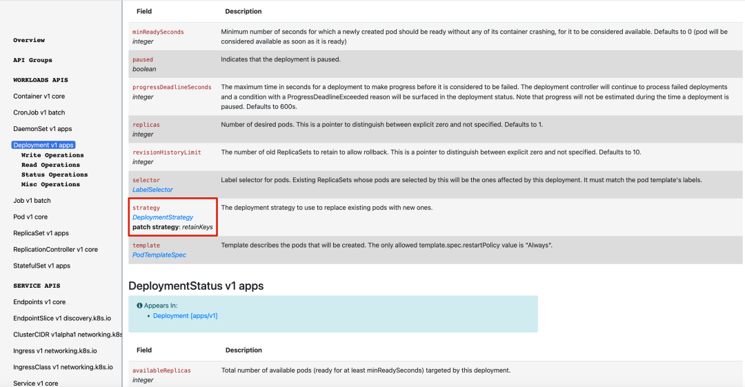 查看 Kubernetes API 文档可以发现 Deployment strategy 的 patch 策略为retainKeys