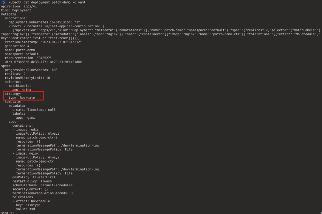 如果我们尝试使用 patch 命令将 Deployment strategy 更新为 Recreate :