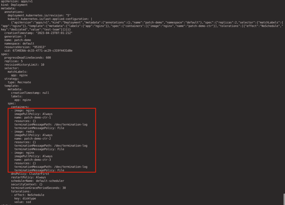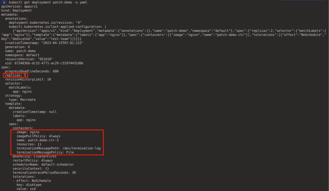 可以看到 replicas 字段被改为了 5,而 containers 列表被完全替换成新的了。
