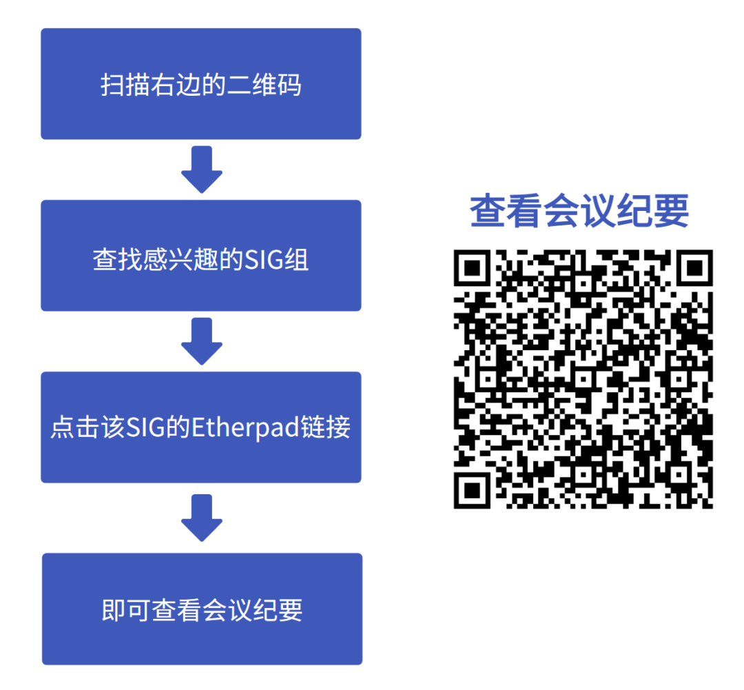 扫描下方二维码即可查看本次SIG组开放工作会议所有SIG的Etherpad链接,欢迎大家找到感兴趣的SIG组,查看本次SIG开放工作会议的会议纪要。