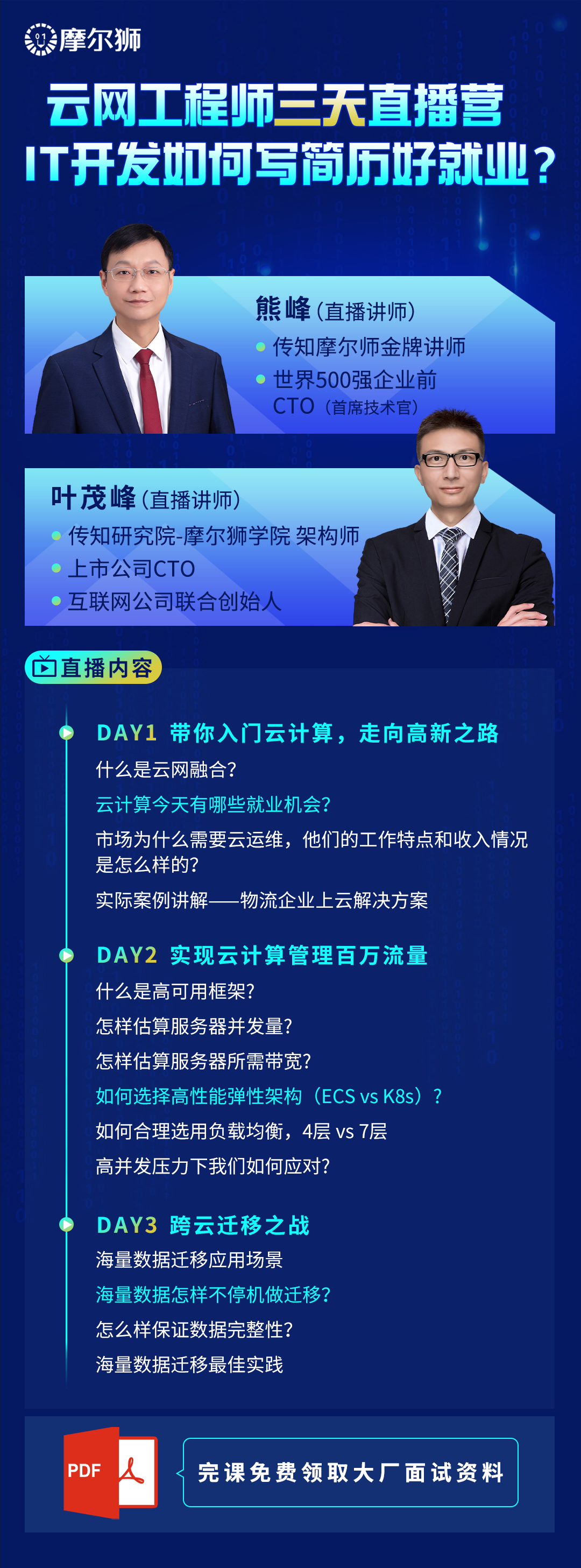 通过《云网工程师三天直播营-如何写好简历好就业》这节课,可以了解国内大厂中系统上云,大佬详解亿级流量电商平台设计底层案例,帮助你用实战课程检验技术,积累经验。