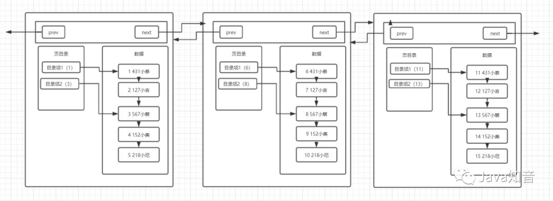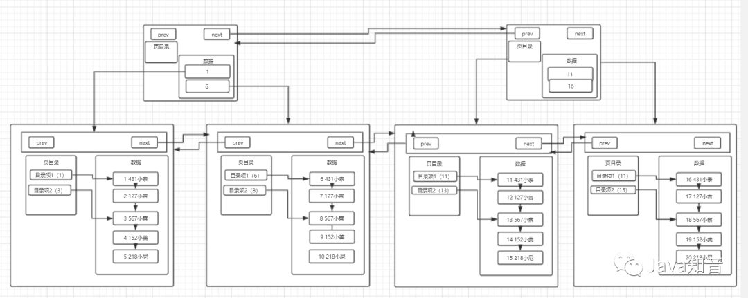 可以看到,在数据不断变多的情况下,MySQL会再去开辟新的页来存放新的数据,而每个页都有指向下一页的指针和指向上一页的指针,将所有页组织起来(这里修改了一下数据,将每一列的数据都放到了数据区中,其中第一个空格之前的代表id),第一页中存放id为1-5的数据,第二页存放id为6-10的数据,第三页存放id为11-15的数据,需要注意的是在开辟新页的时候,我们插入的数据不一定是放在新开辟的页上,而是要进行所有页的数据比较,来决定这条插入的数据放在哪一页上,而完成数据插入之后,最终的多页结构就会像上图中画的那样。
