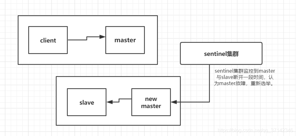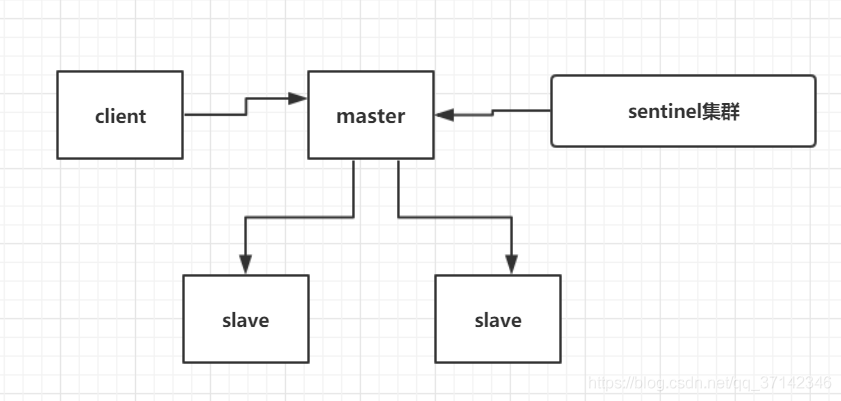 假设我们有一个redis集群,正常情况下client会向master发送请求,然后同步到salve,sentinel集群监控着集群,在集群发生故障时进行自动故障转移。