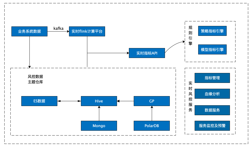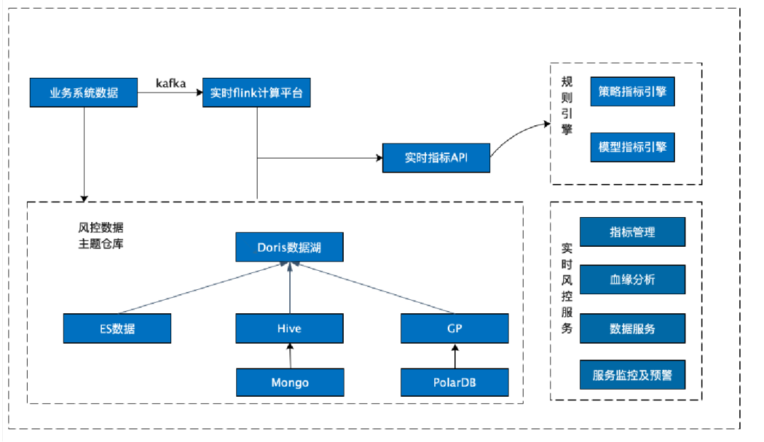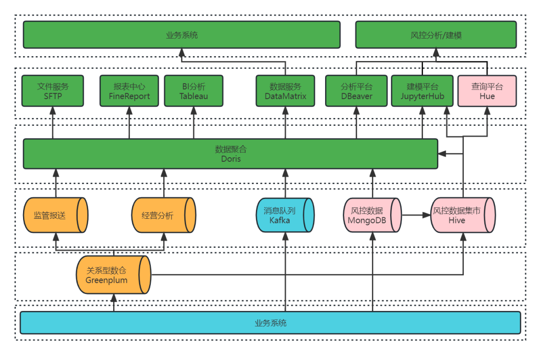 业务系统的核心系统数据通过 CloudCanal 实时同步进入 Greenplum 数仓进行数据实时分析,为 BI 报表,数据大屏等应用提供服务,部分数据进入风控集市 Hive 中,提供查询分析和建模服务。 业务系统的实时数据推送到 Kafka 消息队列,经 Flink 实时消费写入 ES,通过风控变量提供数据服务,而 ES 中的部分数据也可以流入 Hive 中,进行相关分析处理。 业务系统的风控数据会落在 MongoDB,经过离线同步进入风控集市 Hive,Hive 数仓支撑了查询平台和建模平台,提供风控分析和建模服务。