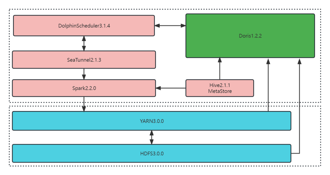 前段时间,Apache Doris 1.2.2 版本已经发布,为了更好的支撑应用服务,我们使用 Apache Doris 1.2.2 与 DolphinScheduler 3.1.4 调度器、SeaTunnel 2.1.3 数据同步平台等开源软件实现了集成,以便于数据定时从 Hive 抽取到 Doris 中。整体的数据集成方案如下: