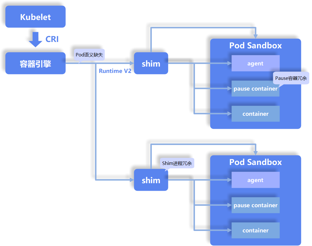 Kubernetes 的 CRI 规范强化了 Pod Sandbox 的概念,将 Pod 作为容器编排调度的最小单元。Pod 是一个或多个容器的组合,他们共享一些命名空间和资源,沙箱(Sandbox)则通过容器隔离技术为这一组容器提供安全隔离的运行环境。然而,Pod 的语义在容器引擎和容器运行时的层面并没有很好的体现出来,这导致这些组件在架构上的不合理,同时也增加了实现的复杂度,带来了很多维护上的问题,比如 shim 进程的管理和维护,IO 通道的维护等等。