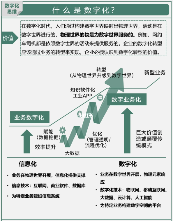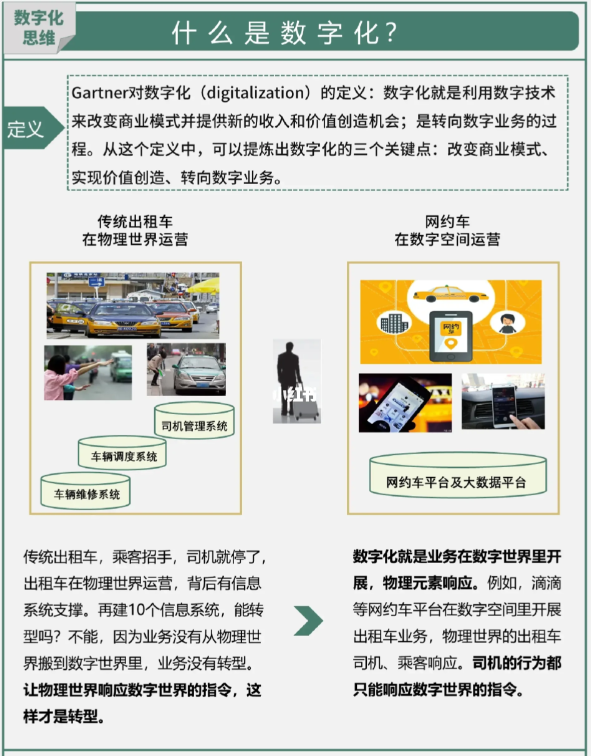 从这个定义中,我们提炼出数字化的三个关键点:改变商业模式、实现价值创造、转向数字业务。
