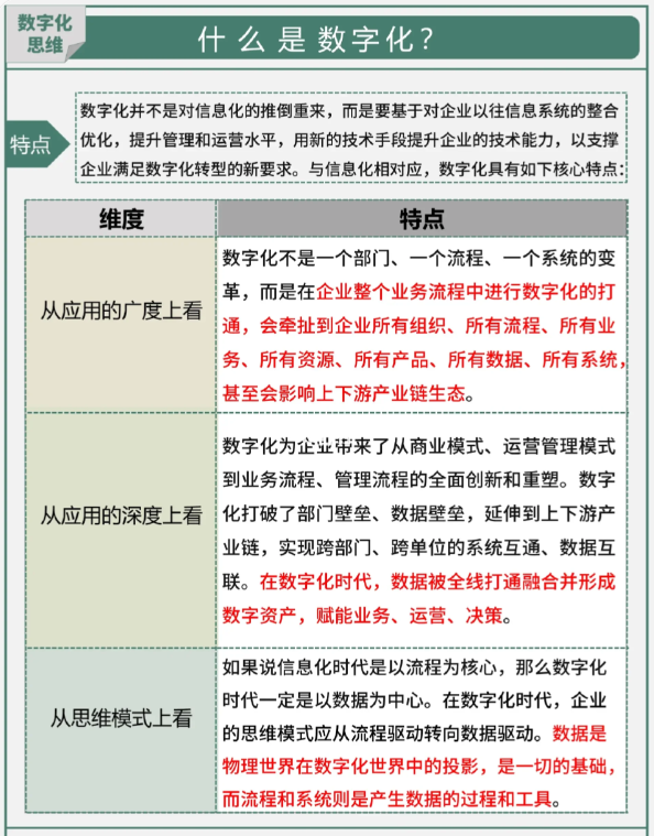 (1)从应用的广度上看,数字化不是一个部门、一个流程、一个系统的变革,而是在企业整个业务流程中进行数字化的打通,会牵扯到企业所有组织、所有流程、所有业务、所有资源、所有产品、所有数据、所有系统,甚至会影响上下游产业链生态。