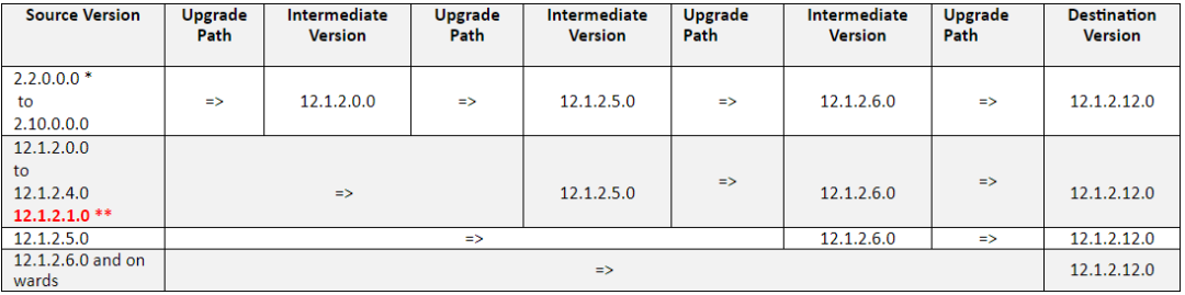 所以,第一阶段的最终升级路线为:2.8.0.0.0 -> 12.1.2.0.0 -> 12.1.2.5.0 -> 12.1.2.6.0 -> 12.1.2.12.0。