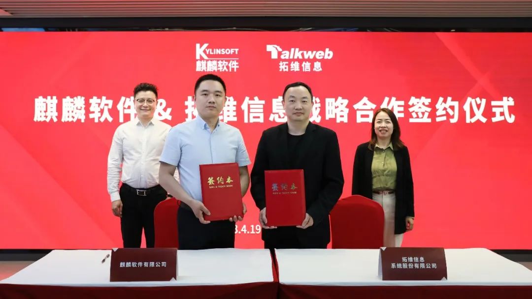 近日,拓维信息系统股份有限公司(以下简称“拓维信息”)与麒麟软件战略合作协议签约仪式在长沙拓维信息软件园举行。在拓维信息副总裁封模春,麒麟软件高级副总裁、区域营销中心总经理宋介鹏的共同见证下,拓维信息供应链总监李华荣与麒麟软件湖南事业部总经理张赞代表双方签署战略合作协议。双方将在核心技术研发与市场推广等领域深度合作,联合打造国产化解决方案,助力交通、教育、医疗等行业数字化发展。