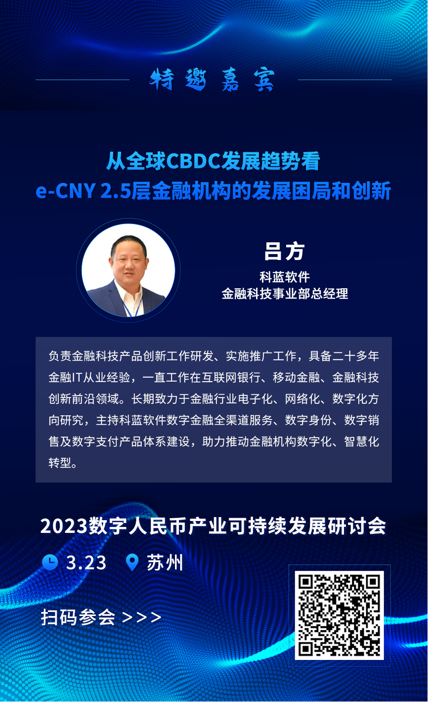 由苏州数字金融产业联合会、移动支付网联合举办的“2023数字人民币产业可持续发展研讨会”,将于2023年3月23日在苏州举办。科蓝软件金融科技事业部总经理吕方受邀出席研讨会,分享最新研究成果和2.5层金融机构实践。自2020年正式开放2.5层金融机构参加e-CNY试点工作以来,试点地区法人银行积极参与,为e-CNY业务推广和场景创新发挥着重要作用,但同时因为与运营机构在角色定位、责任划分和信息保护等环节缺乏清晰规范,给2.5层机构带来较多困扰和担忧。而从各国CBDC的总体设计来看,如何有效激活2.5层机构参与热情,通过整合CBDC基础支付能力并叠加自身个性化服务为公众提供综合金融服务,将是e-CNY顺利落地不可或缺环节。此次研讨会上,吕方将以《从全球CBDC发展趋势看e-CNY 2.5层金融机构的发展困局与创新》为题,分享科蓝CBDC研究中心近来对全球央行数字货币发展研究,并结合e-CNY运营架构和创新实践,共同探讨如何推动数字人民币2.5层金融机构持续发展。欢迎大家扫码参会,莅临现场交流!吕方,现任北京科蓝软件金融科技事业部总经理,负责金融科技产品创新工作研发、实施推广工作,具备二十多年金融IT从业经验,一直工作在互联网银行、移动金融、金融科技创新前沿领域。长期致力于金融行业电子化、网络化、数字化方向研究,主持科蓝软件数字金融全渠道服务、数字身份、数字销售及数字支付产品体系建设,助力推动金融机构数字化、智慧化转型。