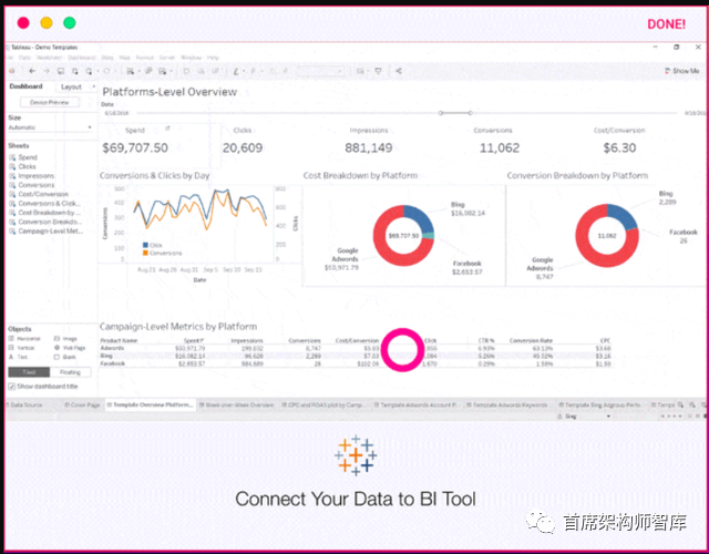 数据可以在Improvado仪表板中可视化,或者使用您选择的BI工具。
